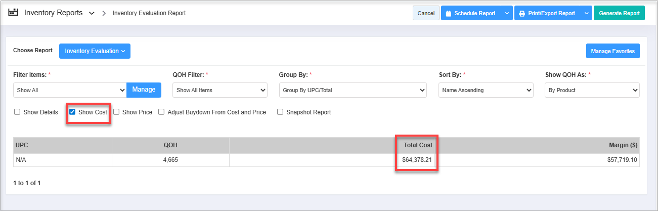 Tick the "Show Cost" checkbox to check the cost of each product. By ticking the "Show Cost" checkbox and generating the report, the two columns, Cost Each and Total Cost, will be displayed in the Inventory Evaluation Report.