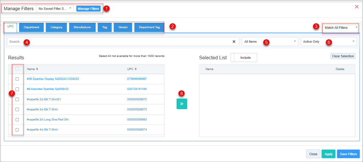 - Parameter Tabs: You will see six tabs: UPC, Department, Category, Manufacturer, Tag, Vendor, and Department Tag. Select the required tab, i.e., UPC, to create or apply a custom filter specific to the selected UPCs.