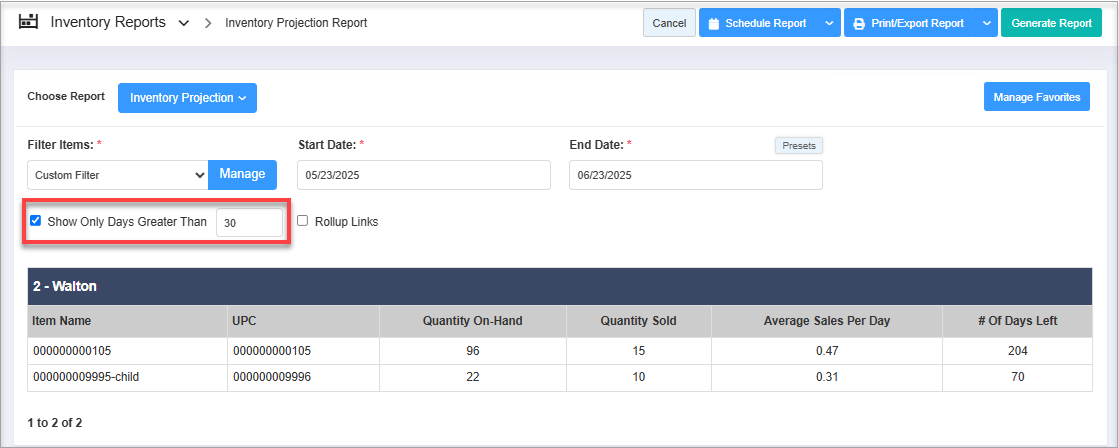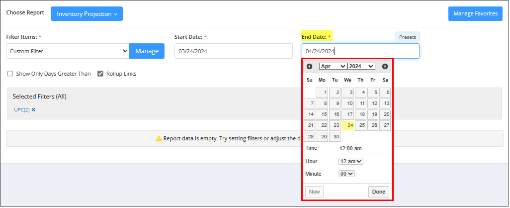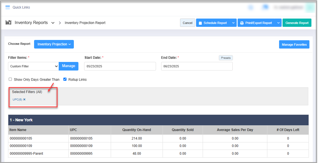 By clicking "Inventory Projection Report," you will be redirected to the "Inventory Projection Report," where you can see relevant filtering and sorting options.
