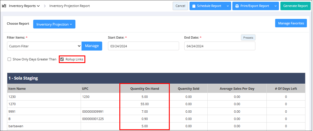 - Rollup Links: This filter will combine the related parent and child items to give you the total quantity on hand value of the product in decimal format.