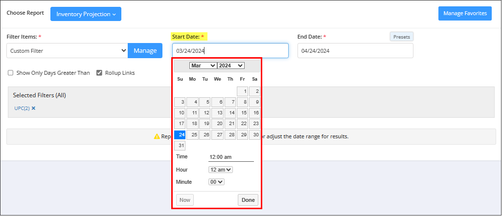 Let's understand the custom filter options to generate the Inventory Projection Report by setting up specific criteria.