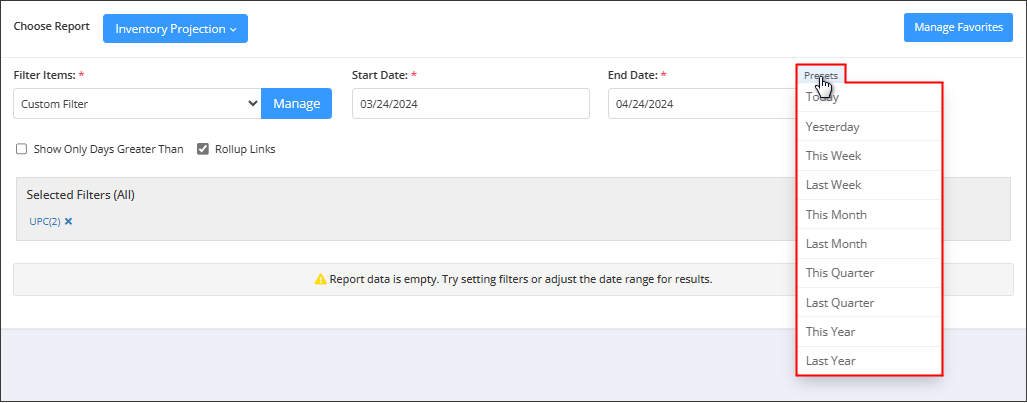 Figure 4.2.2- Presets: The Presets label is provided to select the specific duration/interval to generate the "Inventory Projection Report" according to the selected time period.