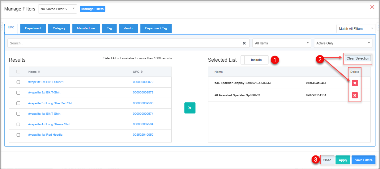 - Parameter Tabs: You will see seven tabs: UPC, Department, Category, Manufacturer, Tag, Vendor, and Department Tag. Select the required tab, i.e., "UPC," to create or apply a custom filter specific to the selected UPCs.