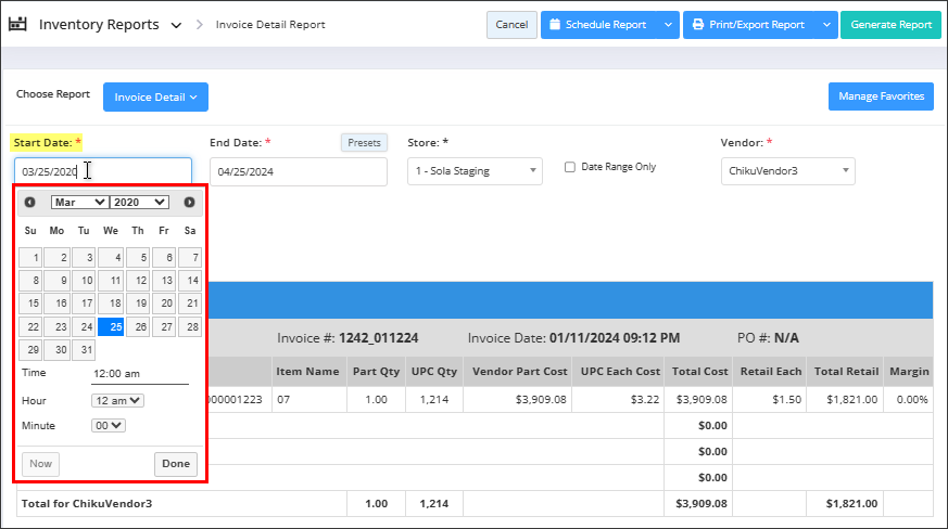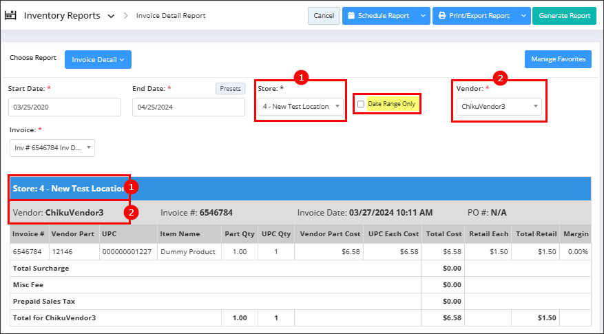 Date Range Only: If unchecked, this checkbox filter will display the result report for the selected vendor and selected location, and no other vendor invoice data within that date range. If checked, it will display the invoice data for all the vendors and selected locations within the selected date range.