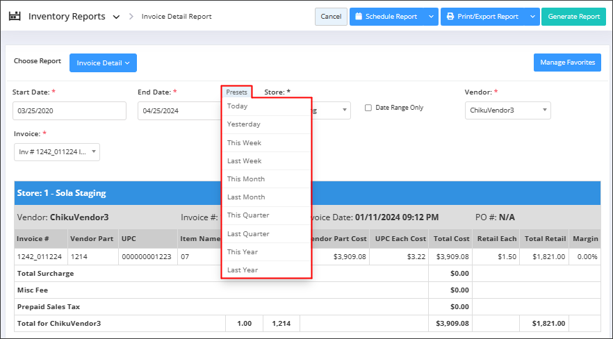 The Presets drop-down menu is provided to select the specific duration/interval to generate the "Invoice Detail Report" according to the selected time period.