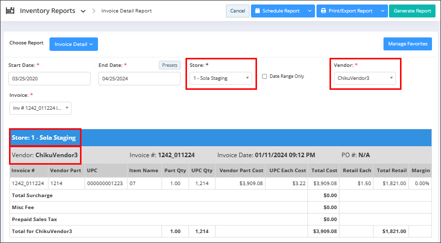 Invoice Detail Report Overview This report lists all items received in a date range for a specific location and vendor, giving details of each item and the invoice that it was attached to. Multiple different types of filters and sorting ...