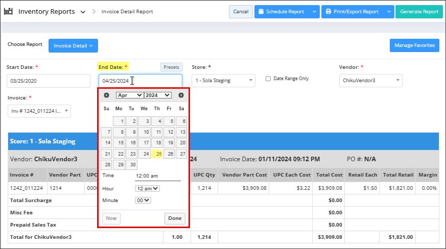 The "Invoice Detail Report" lists all items received in a date range for a specific location and vendor, giving details of each item and the invoice that it was attached to. Multiple different types of filters and sorting functionalities can be configured, depending on user requirements.