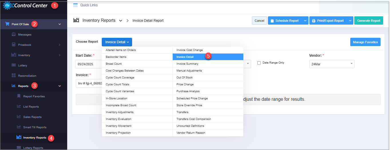 To generate the "Invoice Detail Report," follow the steps below. (See Figure 2.1 above.)