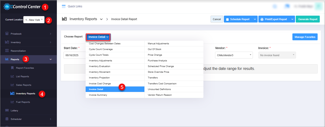 - From the "Invoice Detail Report" page, you will see the "Choose Reports" drop-down selection.