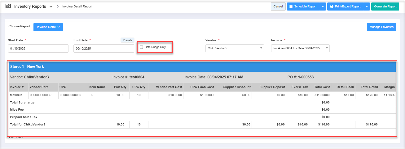 - Date Range Only Checkbox Filter: If checked, this checkbox filter will ensure that the report displays the result for the selected vendor in the vendor field and no other vendor invoice data within that date range. If unchecked, it will display the invoice data for all the vendors within the selected date range.