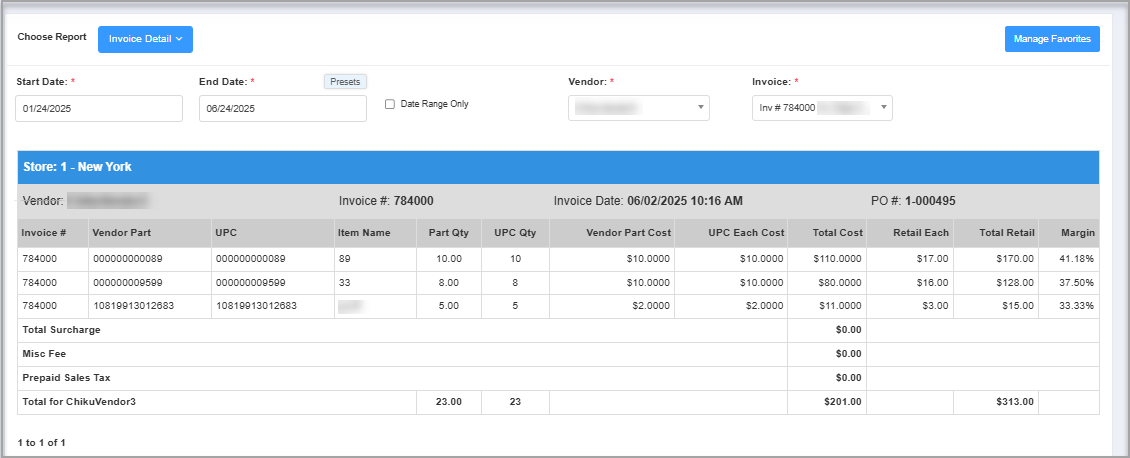 - Example: Select Vendor and Invoice; the report will only show that specific invoice for that vendor within the given dates.