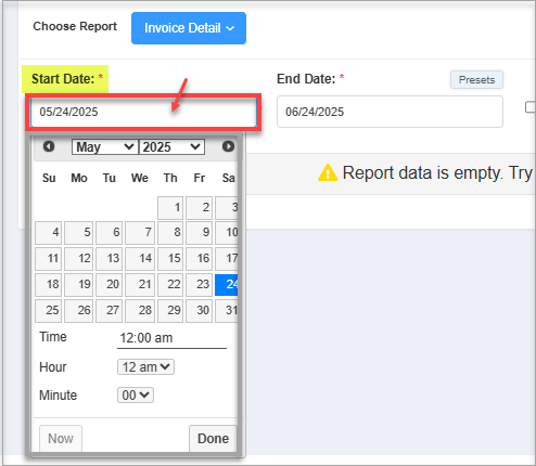 - Start Date: Choose the start date of the selected date range for which you want to view invoice details.