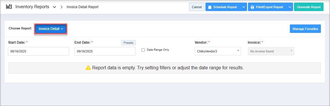Invoice Detail Report Overview: This report type will display detailed information about an invoice for the product(s) purchased from a vendor only in the specifically entered date range. Multiple different types of filters and sorting ...