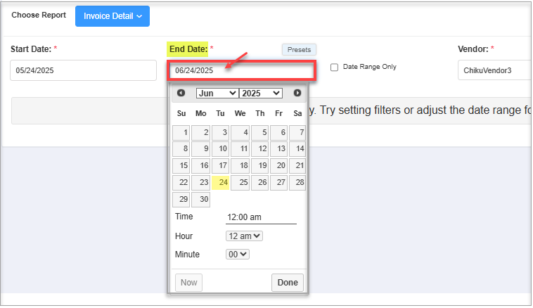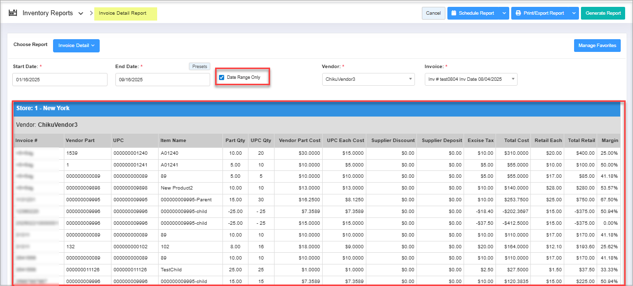 Date Range Only: Displays all invoices within the selected date range, ignoring Vendor and Invoice filters.