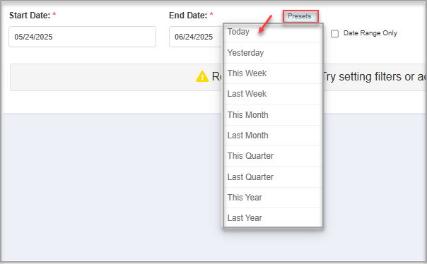 The Presets drop-down menu is provided to select the specific duration/interval to generate the Invoice Detail Report according to the selected time period.