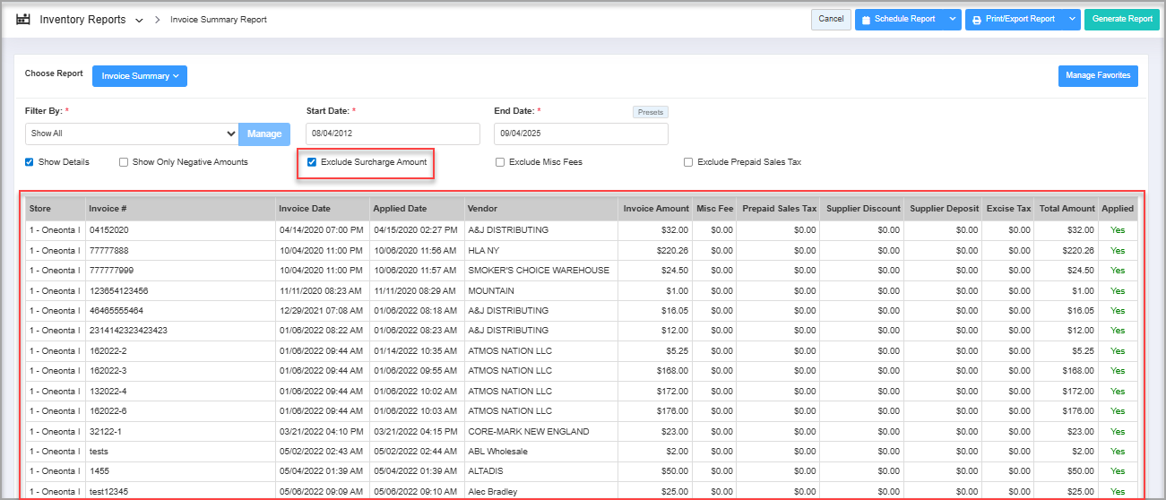 - Exclude Surcharge Amounts: Use the "Exclude Surcharge Amount" checkbox to remove invoices with surcharges from the report. Then click "Generate Report" to apply the filter.
