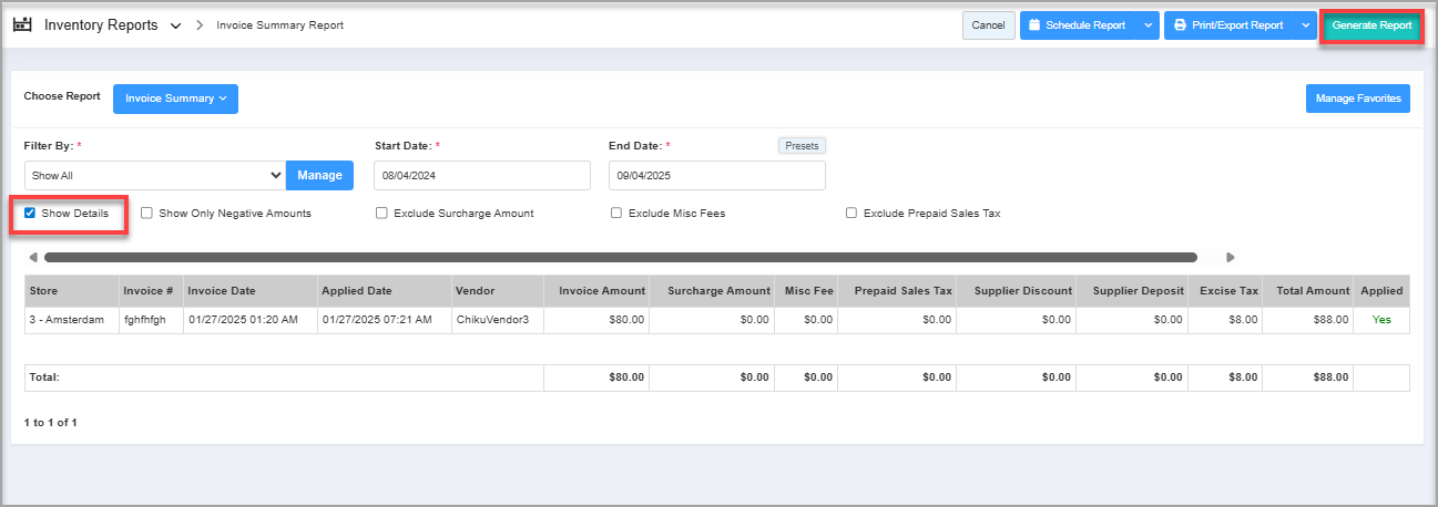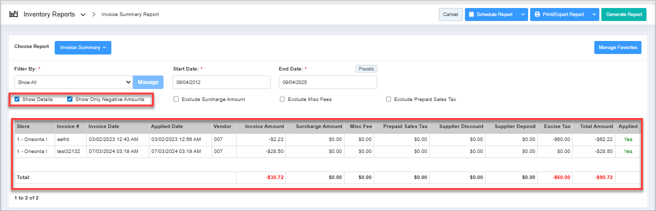 - Show Only Negative Amounts: Use the "Show Only Negative Amounts" checkbox to view records with negative amounts, typically indicating item returns to the vendor. Select the checkbox and click "Generate Report" to proceed.
