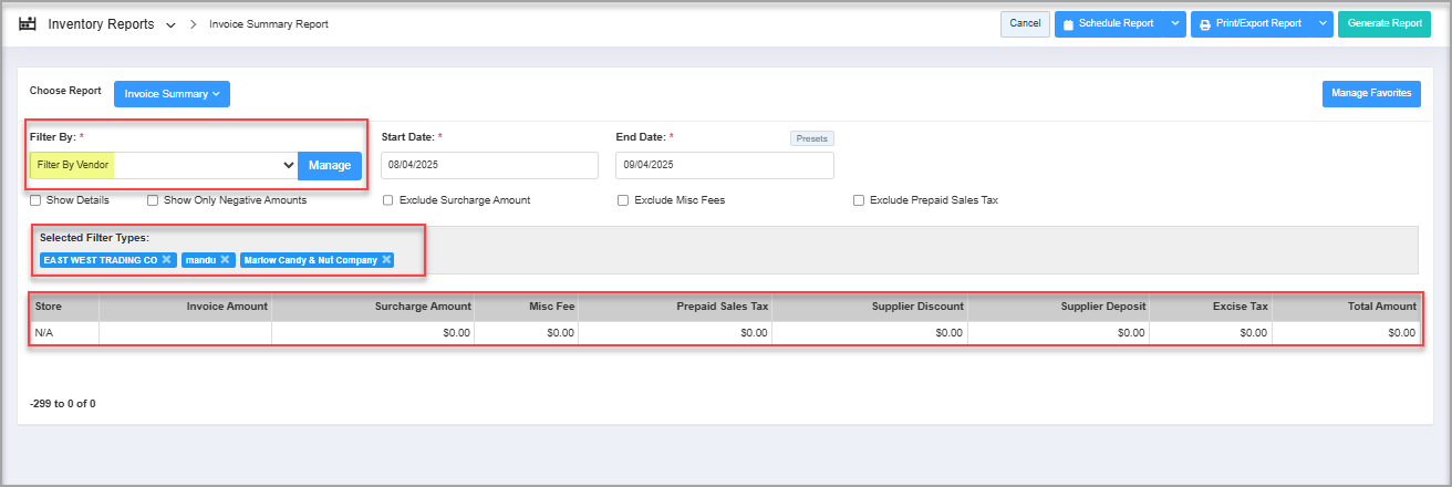 The system will display the Invoice Summary Report screen with your selected vendors. Click "Generate Report" to view records related only to those vendors. Their names will appear under Selected Filter Types (see Figure 3.1.1.4).