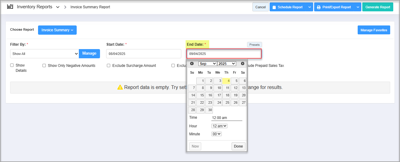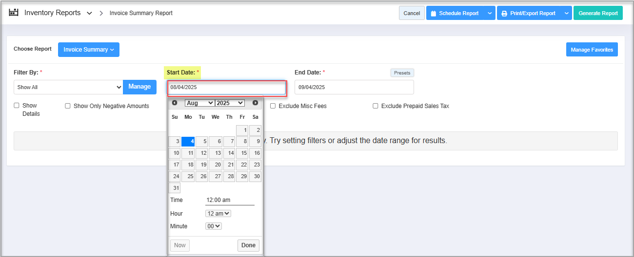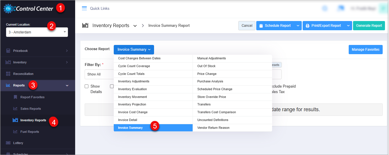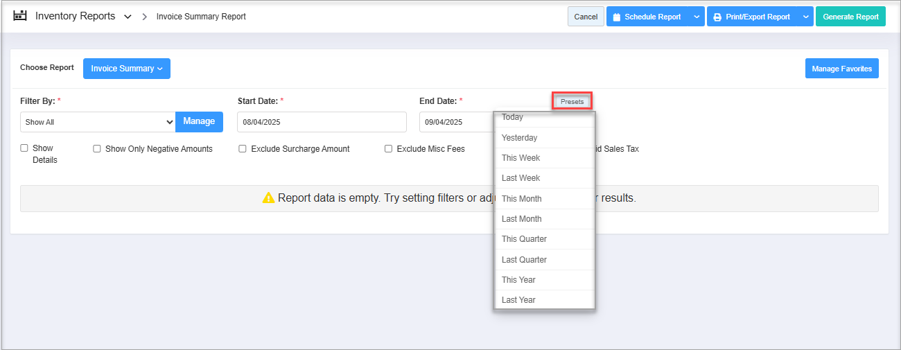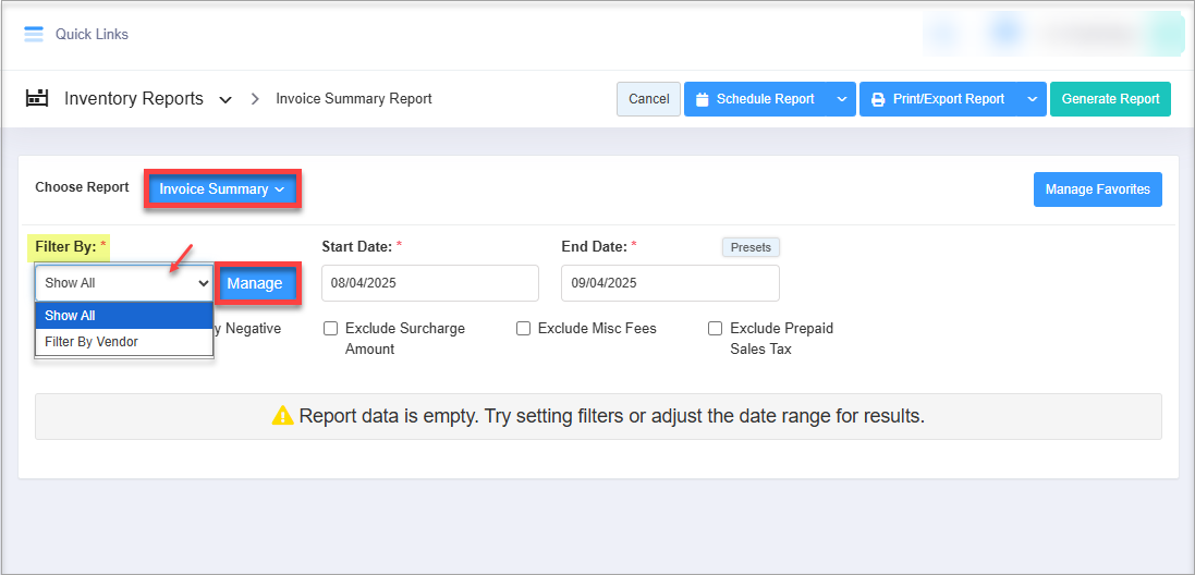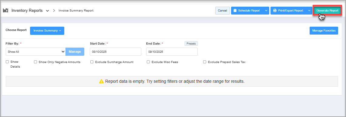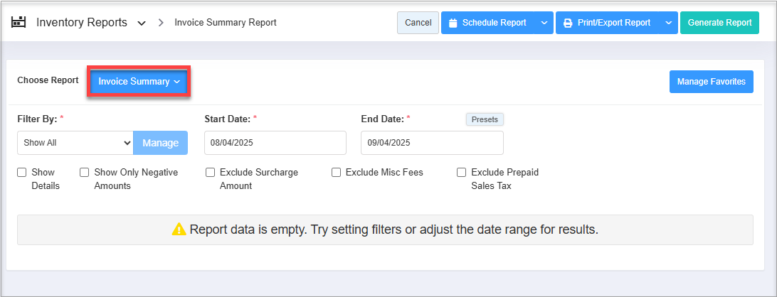 - Navigate to Inventory Report and select Invoice Summary Report from the Choose Report drop-down.
