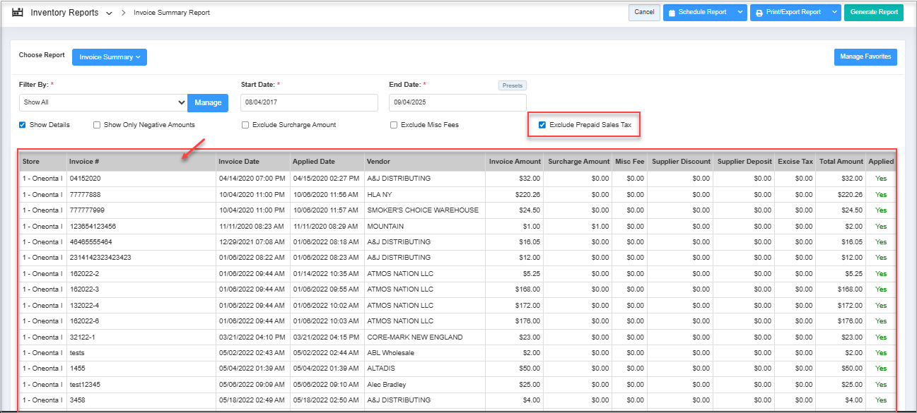 Exclude Prepaid Sales Tax: Use the "Exclude Prepaid Sales Tax" checkbox to remove invoice records with prepaid sales tax from the report. Then click "Generate Report" to apply the filter.