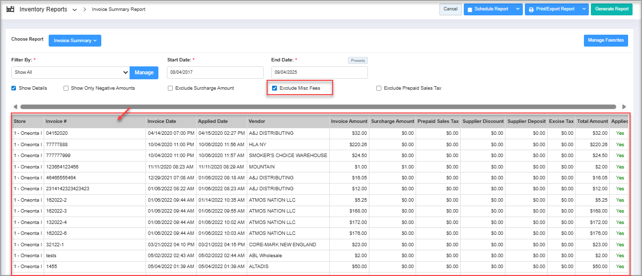- Exclude Misc Fees: Use the "Exclude Misc Fees" checkbox to remove invoices with miscellaneous fees from the report. Then click "Generate Report" to apply the filter.