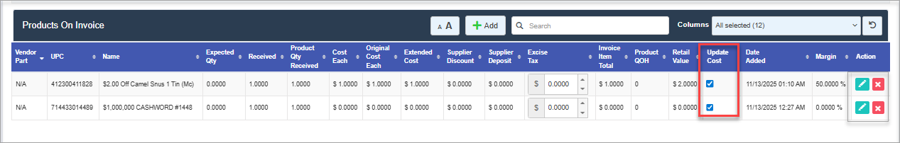 - Update Cost Checkbox: Mark this checkbox to update the product's cost.