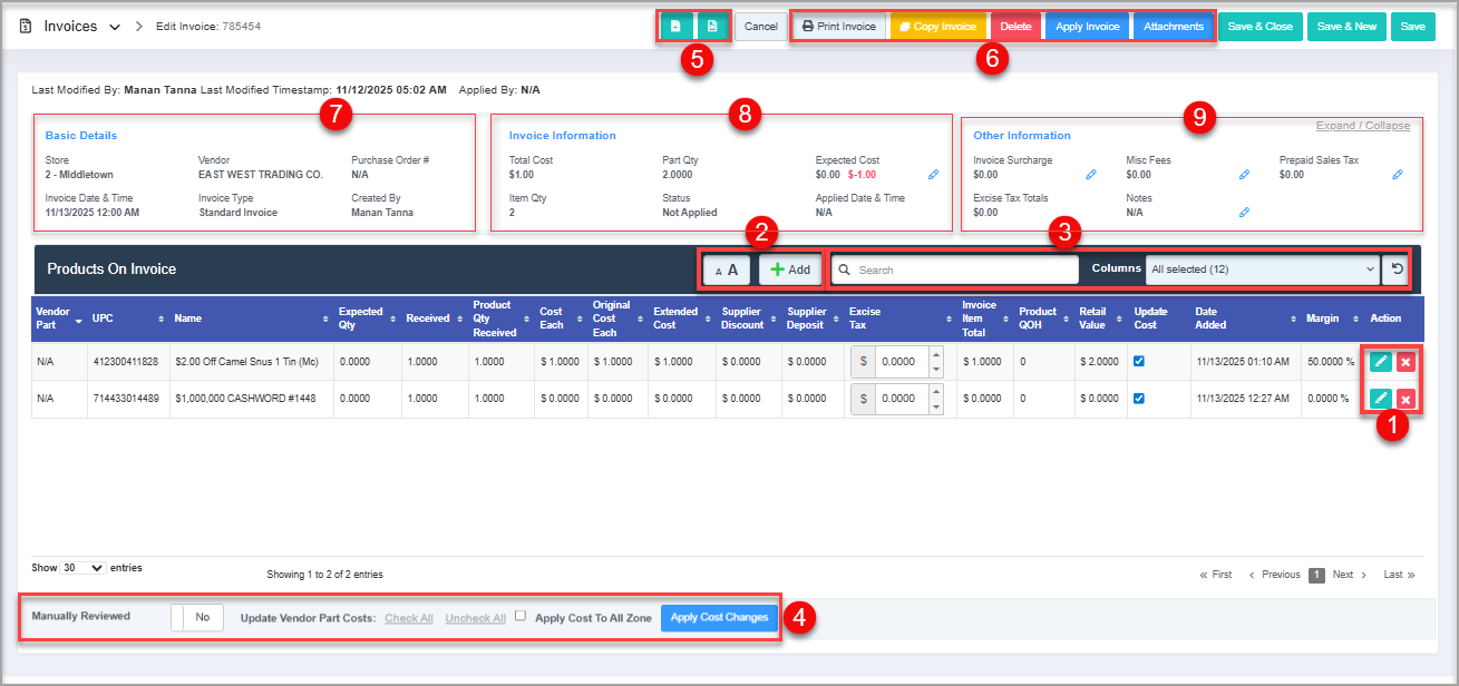 Fields and Buttons:1.1: Edit Product: Click this button to modify the product or its details on the invoice.1.2: Delete Product: Click this button to delete the product from the invoice.2.1. Switch Font: Click this button to switch between large and small fonts.2.2. Add: Click this button to add more products to the invoice.3.1: Search: Use the Search button to allow users to quickly find specific products within the invoice by filtering results based on entered keywords.3.2: Columns: Use this drop-down menu to select the columns you need to view on the invoice. The column options list will appear when you click this drop-down menu, as Figure 1.1.5 shows. Select the columns you wish to view in the invoice.Figure 1.1.63.2: Refresh: Use this button to refresh the information on the invoice if required.4: This section lets you (1) update the product's cost in the system if required. (2) Mark the invoice as "Manually Reviewed."4.1: Manually Reviewed: Enable this button to mark the invoice as "Manually Reviewed." When you enable this button, an alert message will appear, as Figure 1.1.7 shows. Click "Yes." The system will mark the invoice as "Manually Reviewed" and show a success message.Figure 1.1.7Note: Once you mark an invoice as "Manually Reviewed," you cannot undo it.