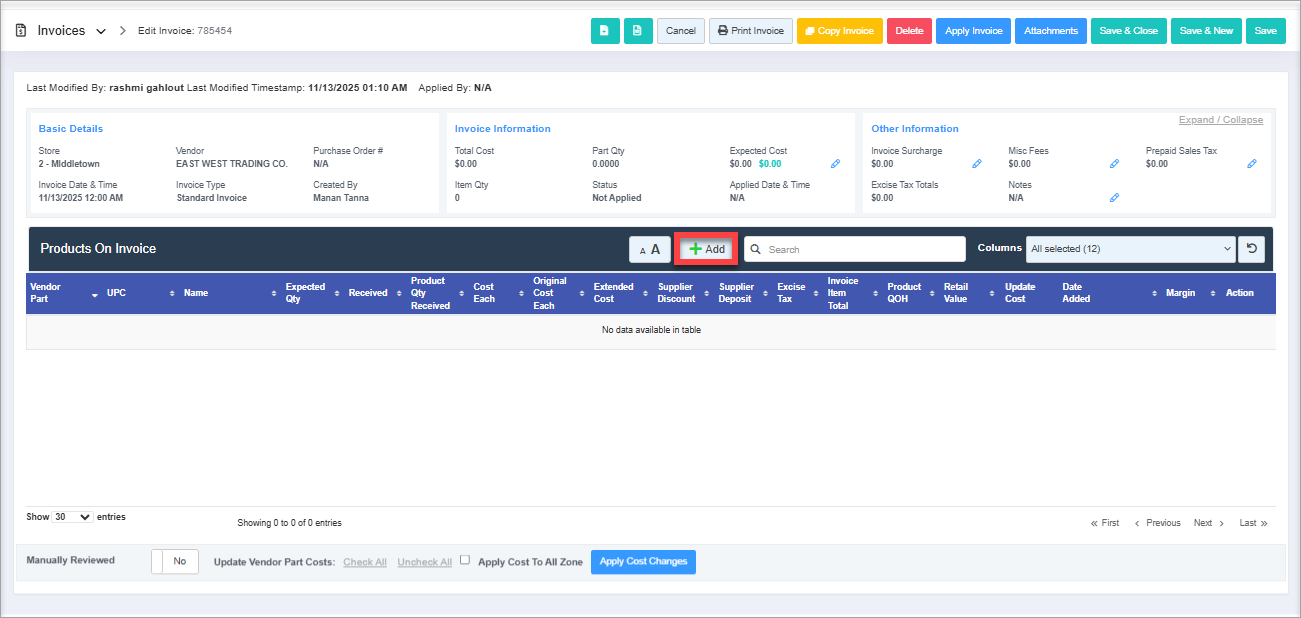 Product UPC: To search for a product using its UPC, input the UPC and press the Enter key on your keyboard.If you use the UPC rather than the vendor part, it will be a single item, while the vendor part might contain more than one. Take this into consideration when setting up the invoice.Figure 1.1.2