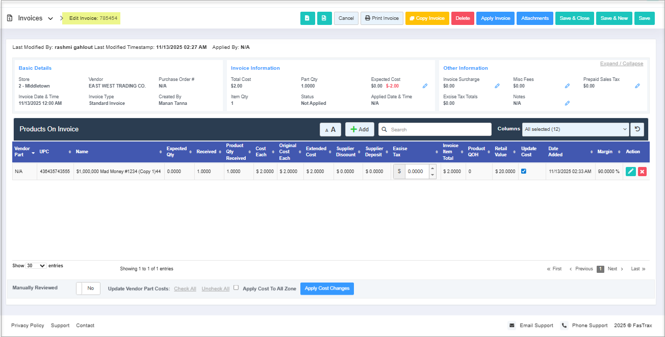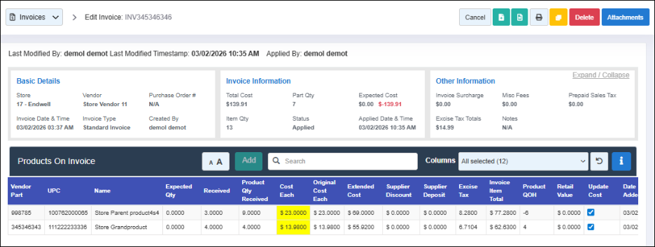 Figure 1.1.94.3: Uncheck All: Click this option to deselect all products to update the cost.4.4: Apply Cost To All Zones: Tick this checkbox to apply the cost changes to all pricebook zones.4.5: Apply Cost Changes: Click this button to apply the cost changes.5.1: Add Notes: This button lets you add notes to the invoice record for your internal reference. These notes are not for inclusion on the invoice.5.2: View Notes: This button lets you view any notes added to the invoice. When you click this button, the Notes History screen will appear. It will show all notes added to the invoice, information about the user who added them, and timestamps.6.1: Print Invoice: Use this button to print the invoice.6.2: Copy Invoice: Use this button to copy the invoice.6.3: Delete: Use this button to delete the invoice.6.4: Apply Invoice: Use this button to apply the invoice.6.5: Attachment: Use this button to view or add an attachment to the invoice. The Invoice Attachments screen will appear when you click this button, as Figure 1.1.10 shows. If there is one, it will show the attached document. For example, this is useful if you would like to attach the original invoice provided by the vendor.Figure 1.1.10