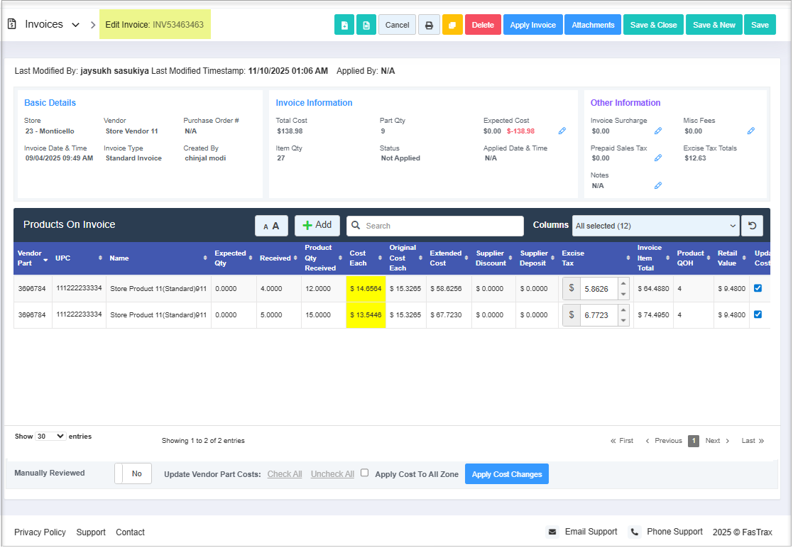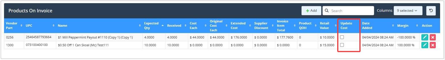 You can also choose a single product by clicking the "Update Cost" checkbox in the Products On Invoice section.