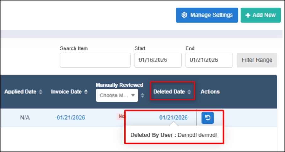 - Status: This displays the invoice status: Applied/Not Applied.