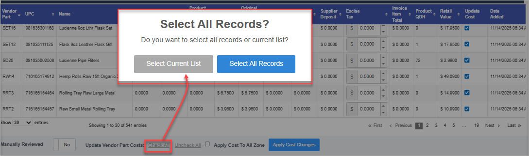 4.2: Check All: Click this option to select all products to update the cost. The screen with the following two options appears.Figure 1.1.8