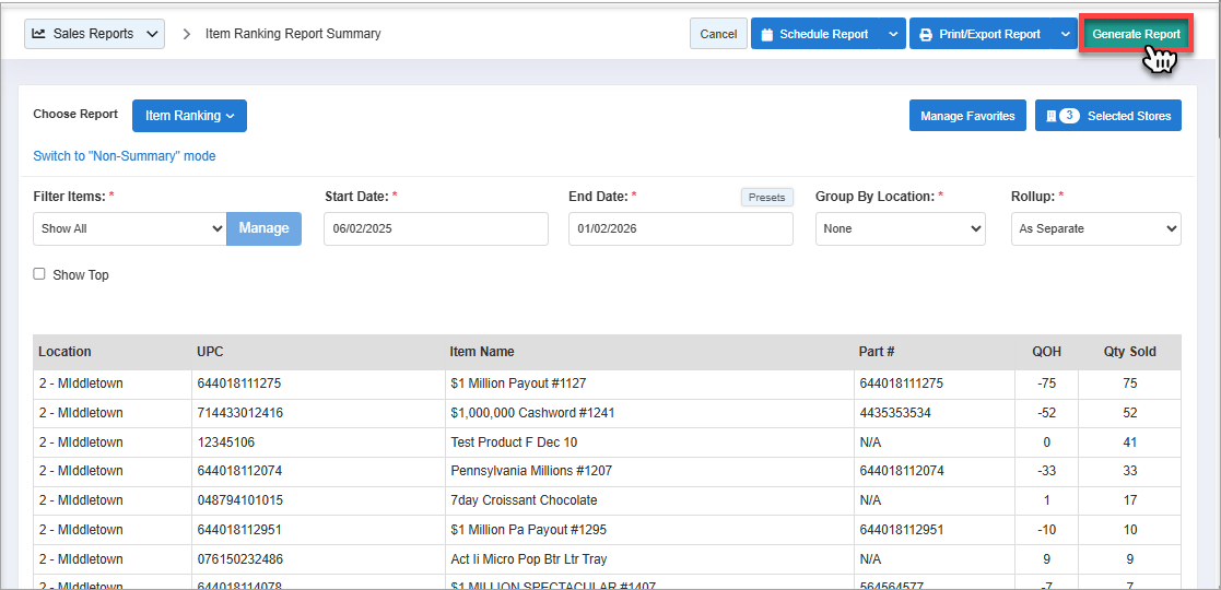 - Select the date range and click "Generate Report" to view the "Item Ranking Report" for the selected date range.