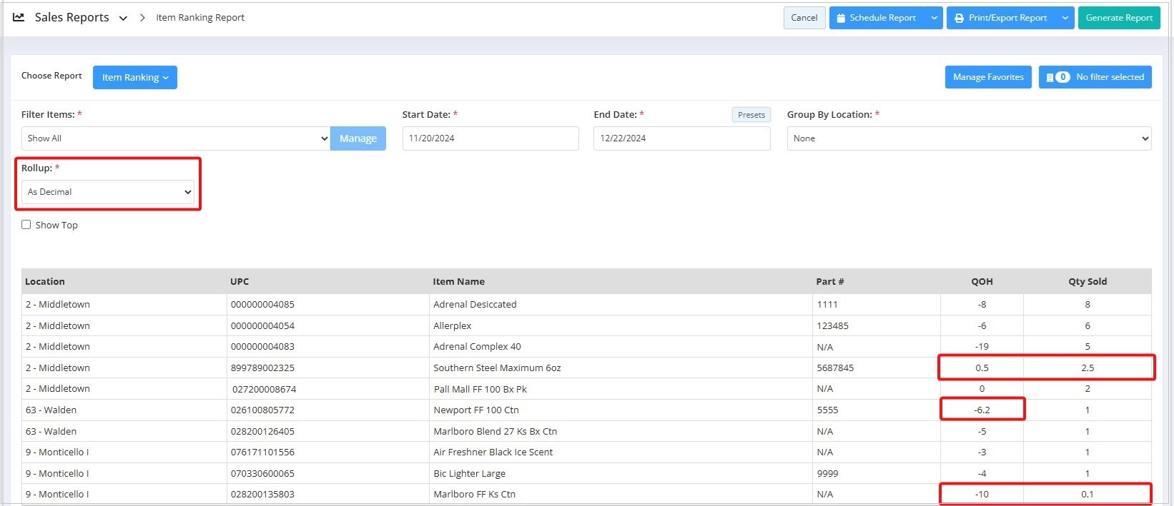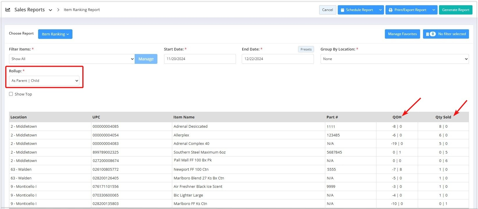 The Rollup filter lets you view the parent product and the child product's quantity based on three parameters: As Separate, As Decimal, and As Parent | Child.