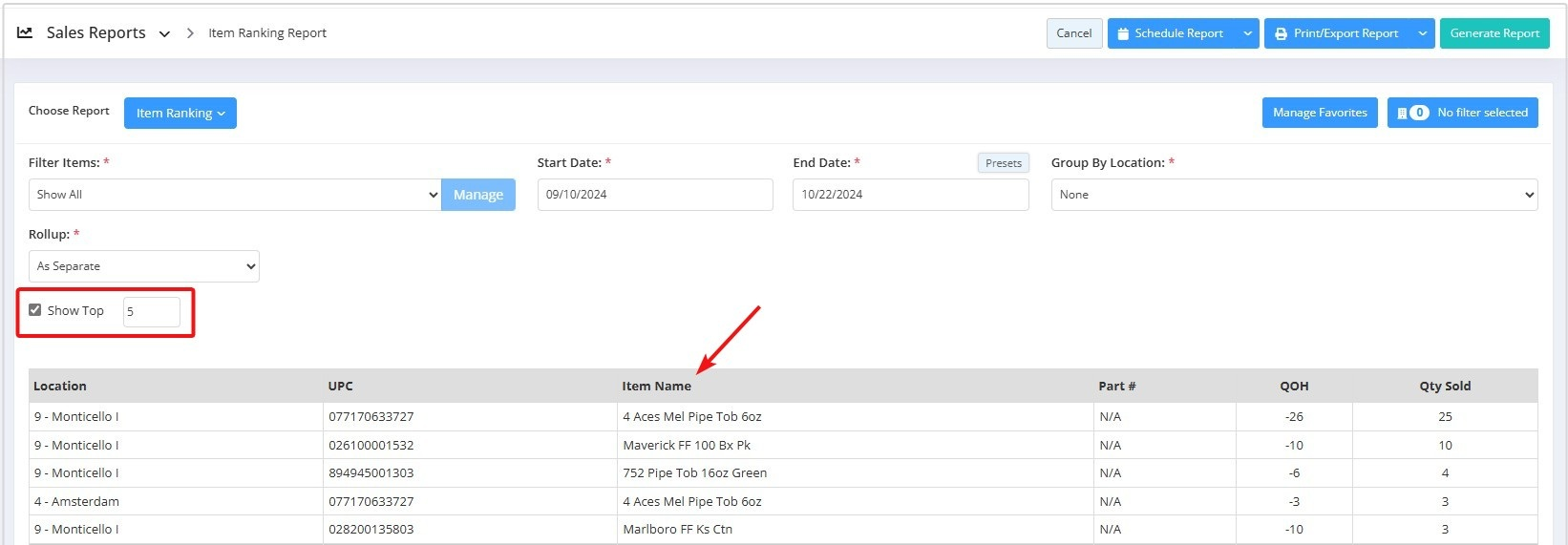 The "Item Ranking Report" presents sales data, ranking items from the highest to the lowest sales at all locations. You can specify how many top-ranking items you want to view.