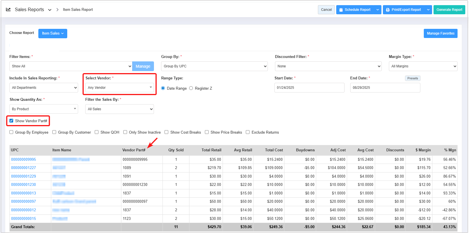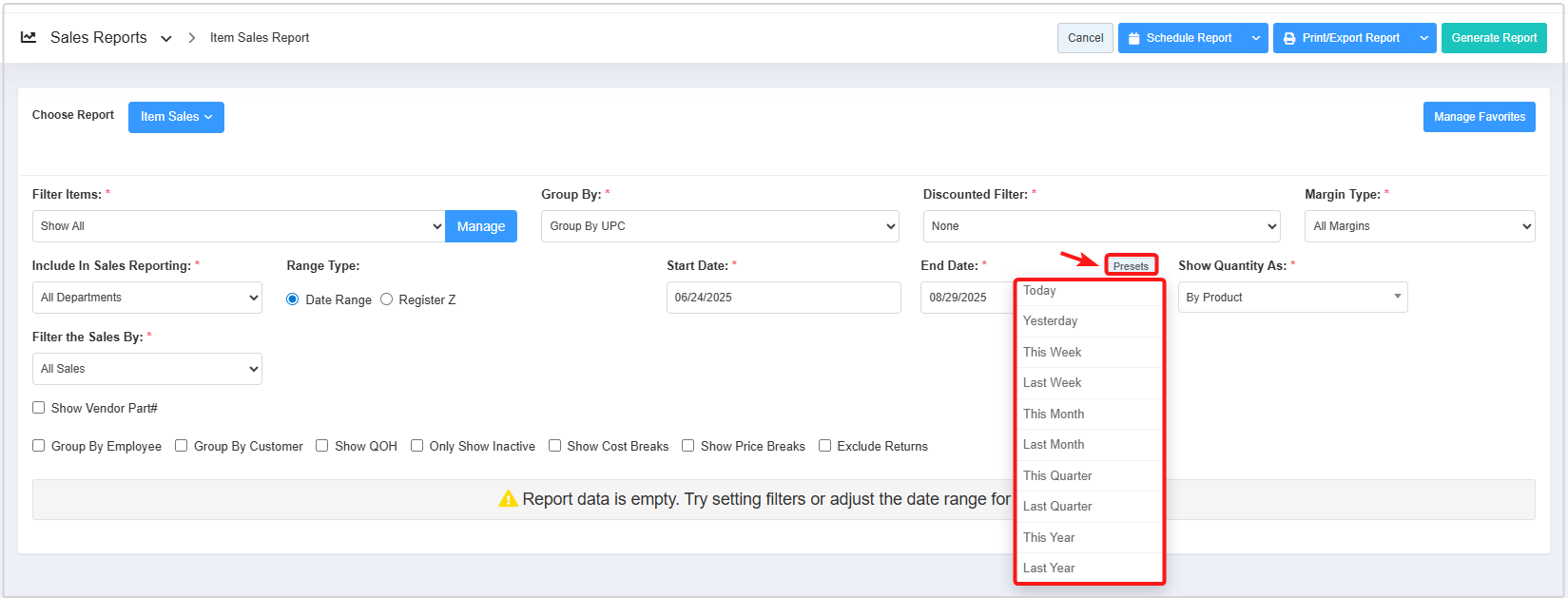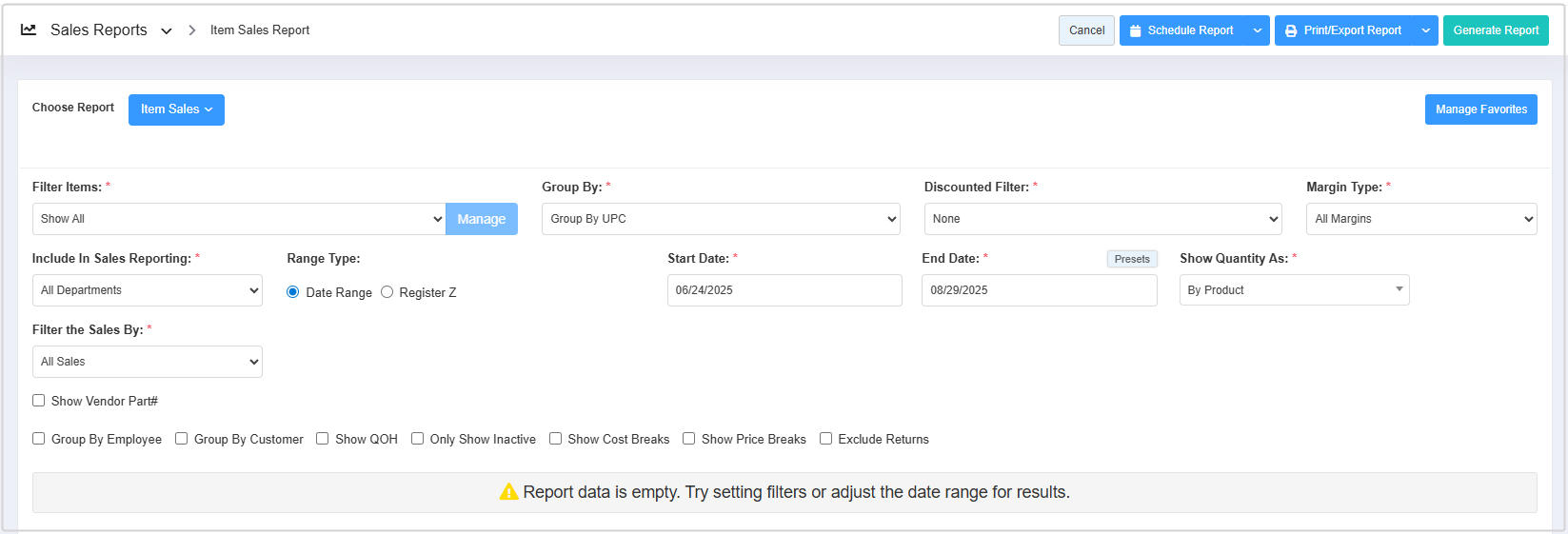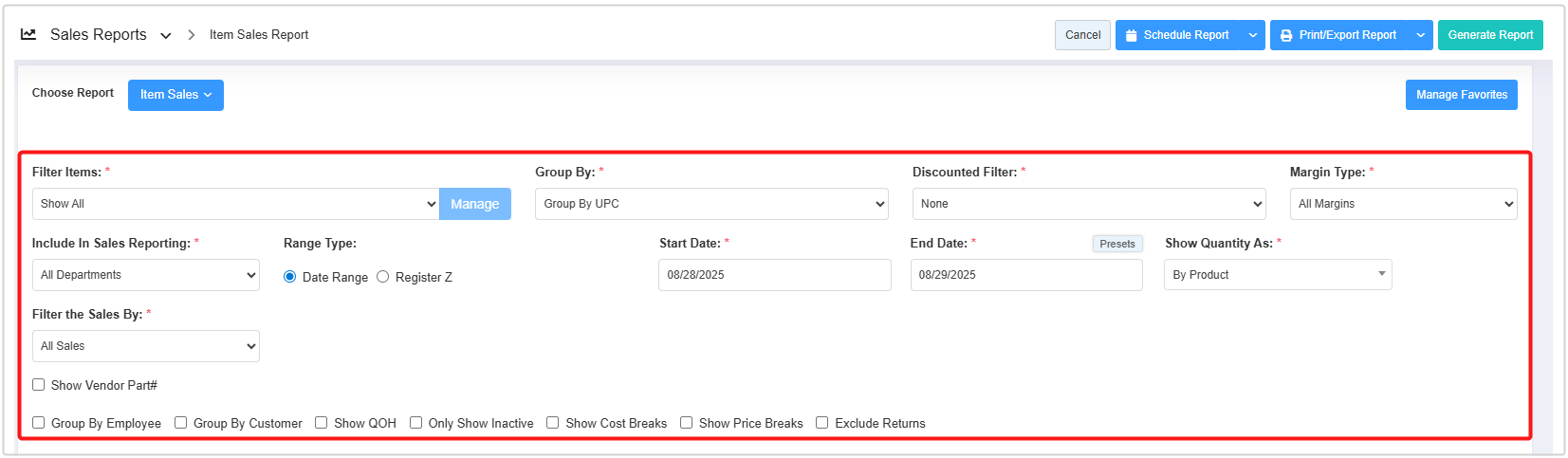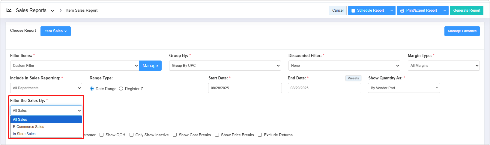- You can use the Filter Items (Custom Filters), Group By, Discounted Filter, Margin Type, Include In Sales Reporting, Date Range & Presets, Show Quantity As, and Filter Sales By filters and Show Vendor Part#, Group By Employee, Group By Customer, Show QOH, Only Show Inactive, Show Cost Breaks, and Show Price Breaks checkbox filters to create the report that meets your requirements. You can use multiple filters to make the report more specific. Please refer to Section 3, Report Filter Options, to learn more about these filters.
