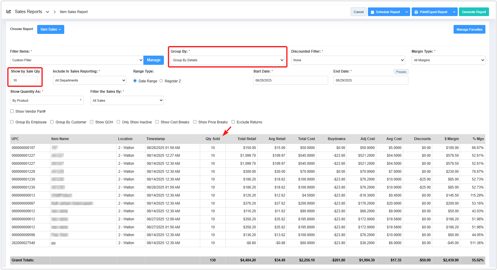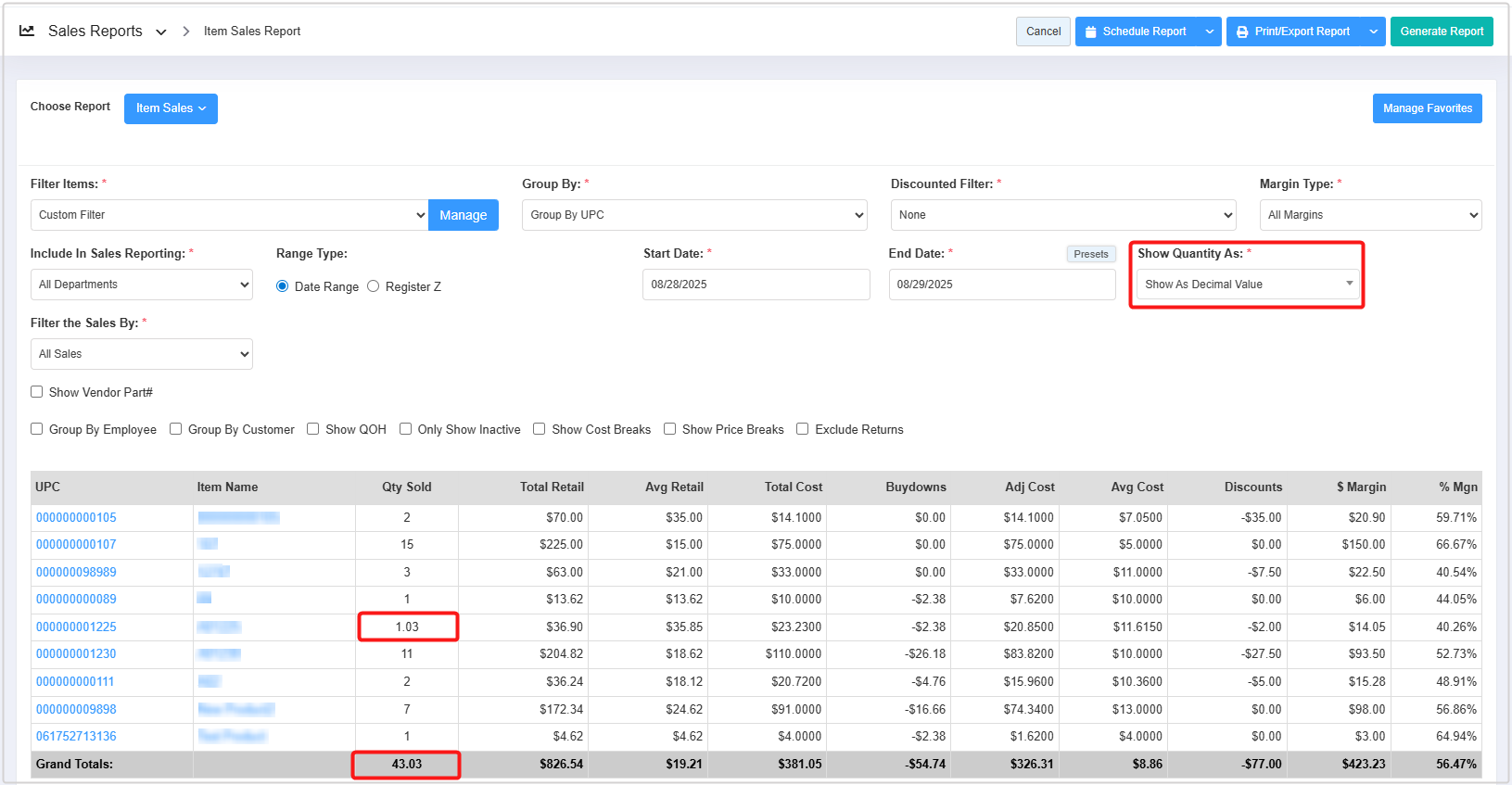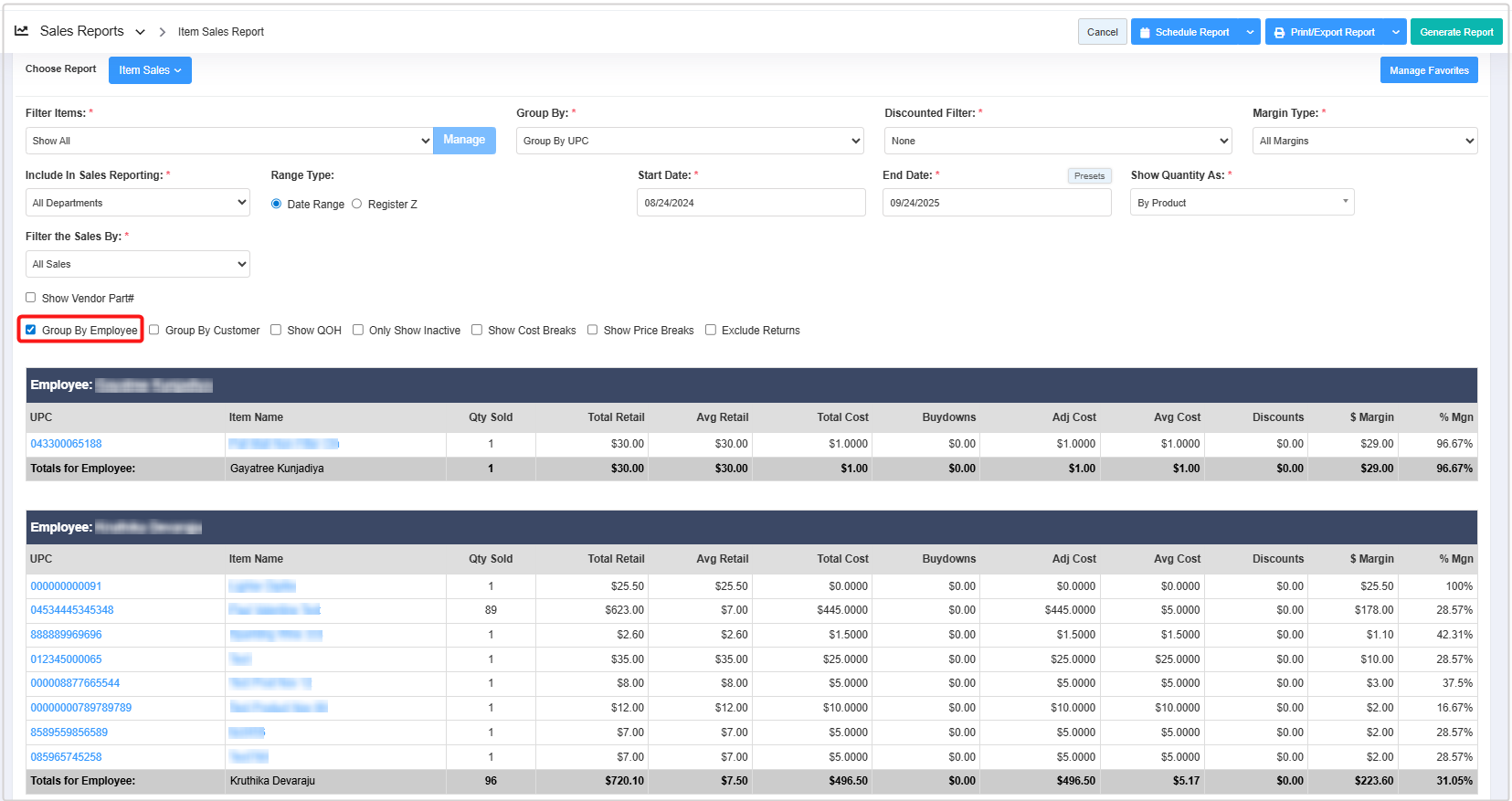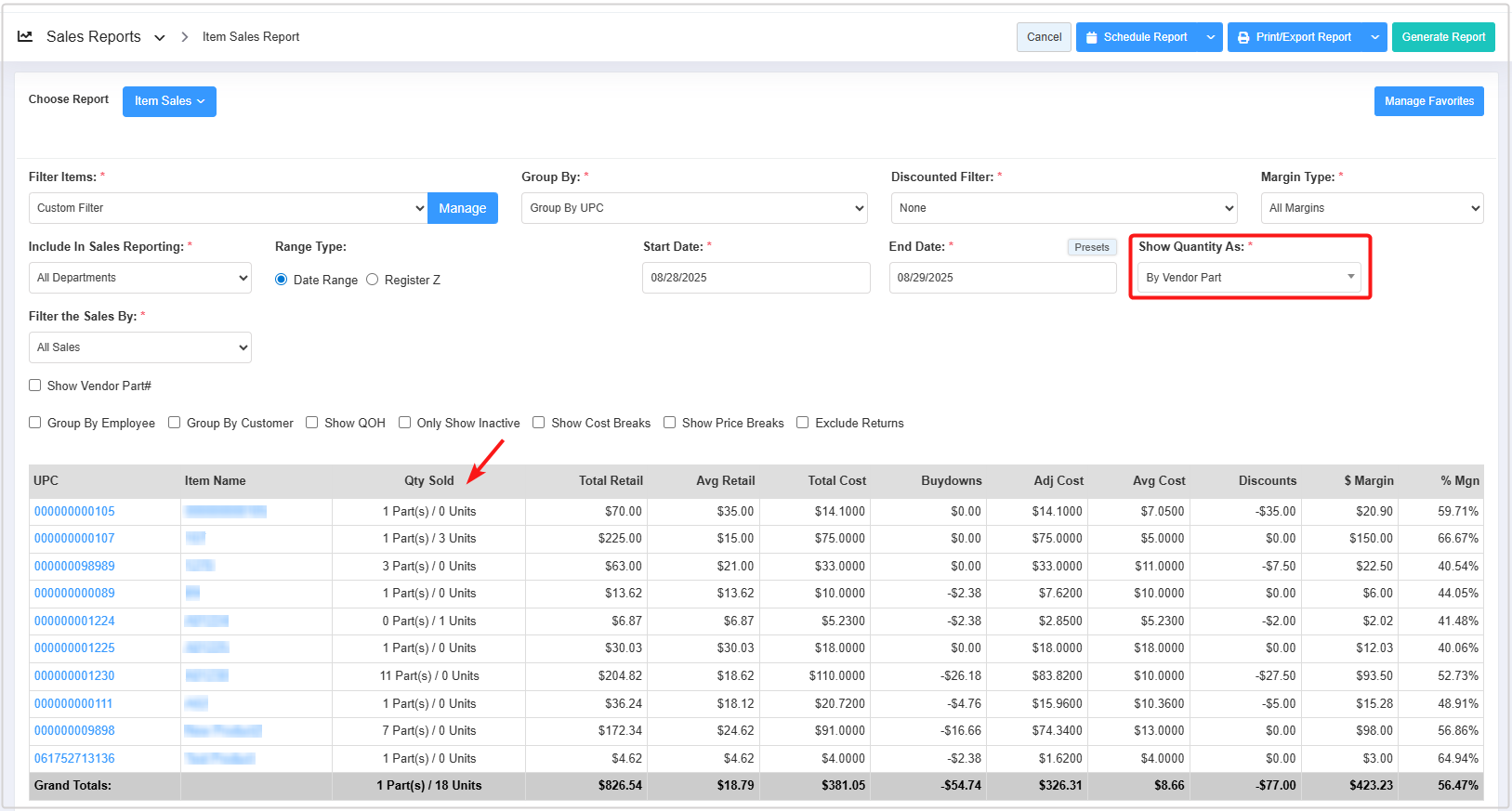 - You can use the Filter Items (Custom Filters), Group By, Discounted Filter, Margin Type, Include In Sales Reporting, Show Quantity As, and Filter Sales By filters and Show Vendor Part#, Group By Employee, Group By Customer, Show QOH, Only Show Inactive, Show Cost Breaks, and Show Price Breaks checkbox filters to create the report that meets your requirements. You can use multiple filters to make the report more specific. Please refer to section 3. Report Filter Options, to learn more about these filters.