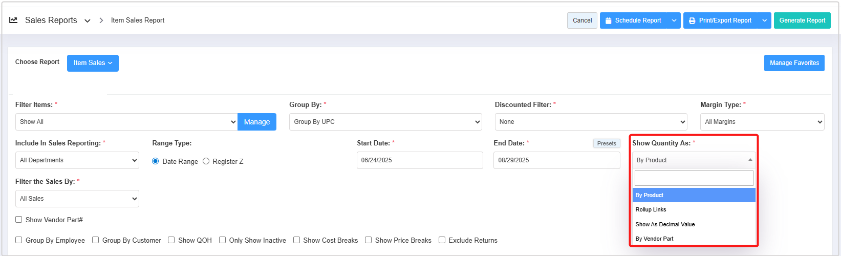 The Show Quantity As option allows you to decide how item quantities are displayed in the sales report. This helps you customize the presentation of quantity data depending on your analysis needs. It has four options: By Product, Rollup Links, Show As Decimal Value, and By Vendor Part.