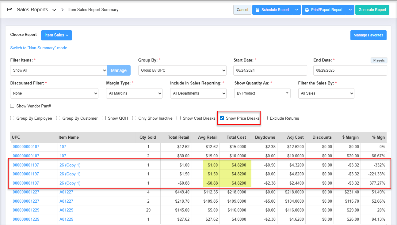 Show Price Breaks: When Show Price Breaks is checked, the report displays multiple entries for the same item based on different selling prices or price tiers (e.g., 000000001197–26 (Copy1) may appear three times with Avg. and Total Retail $1.00, $1.50, and -$0.88).