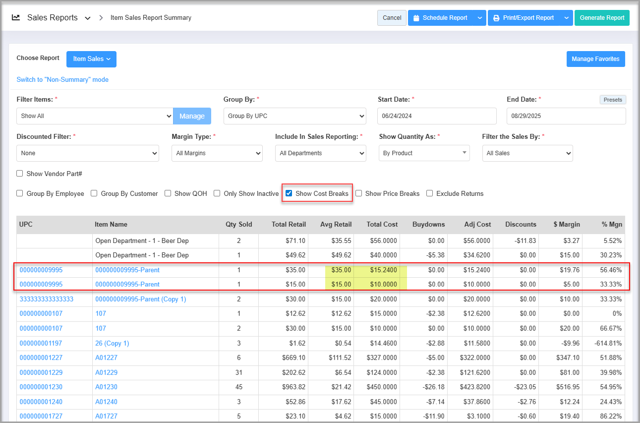 - Show Cost Breaks: Displays item sales split into separate rows when the item cost changes within the selected date range. This helps you analyze cost variations and their impact on margins instead of seeing a single aggregated cost.