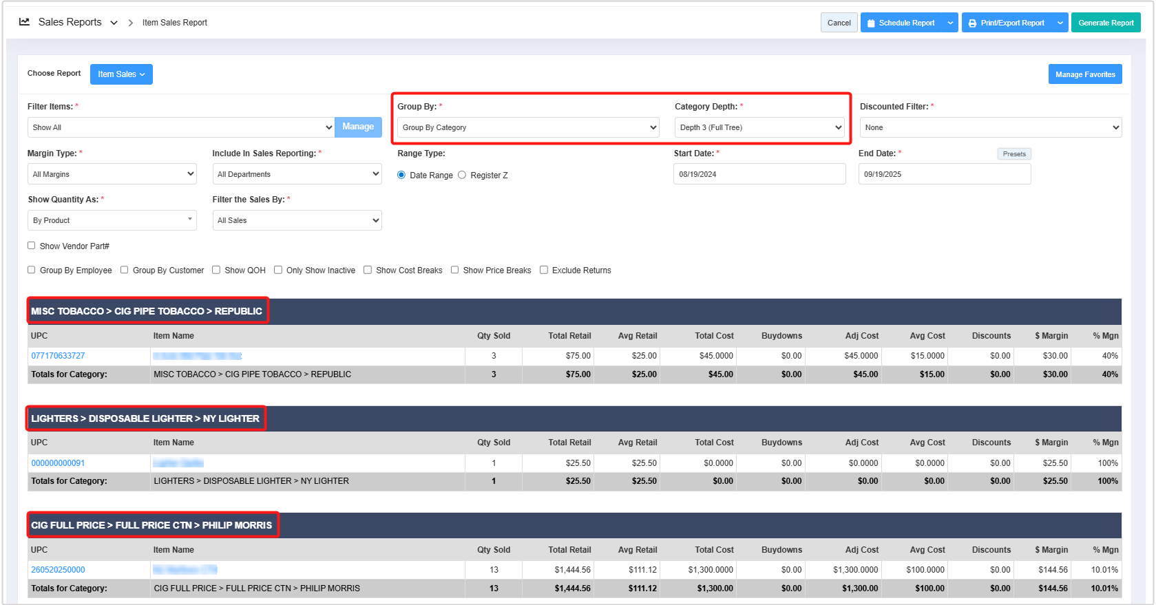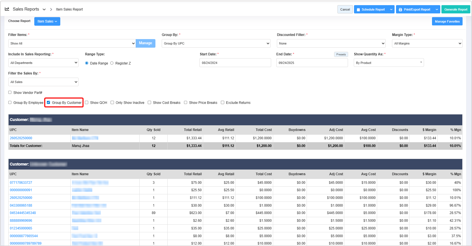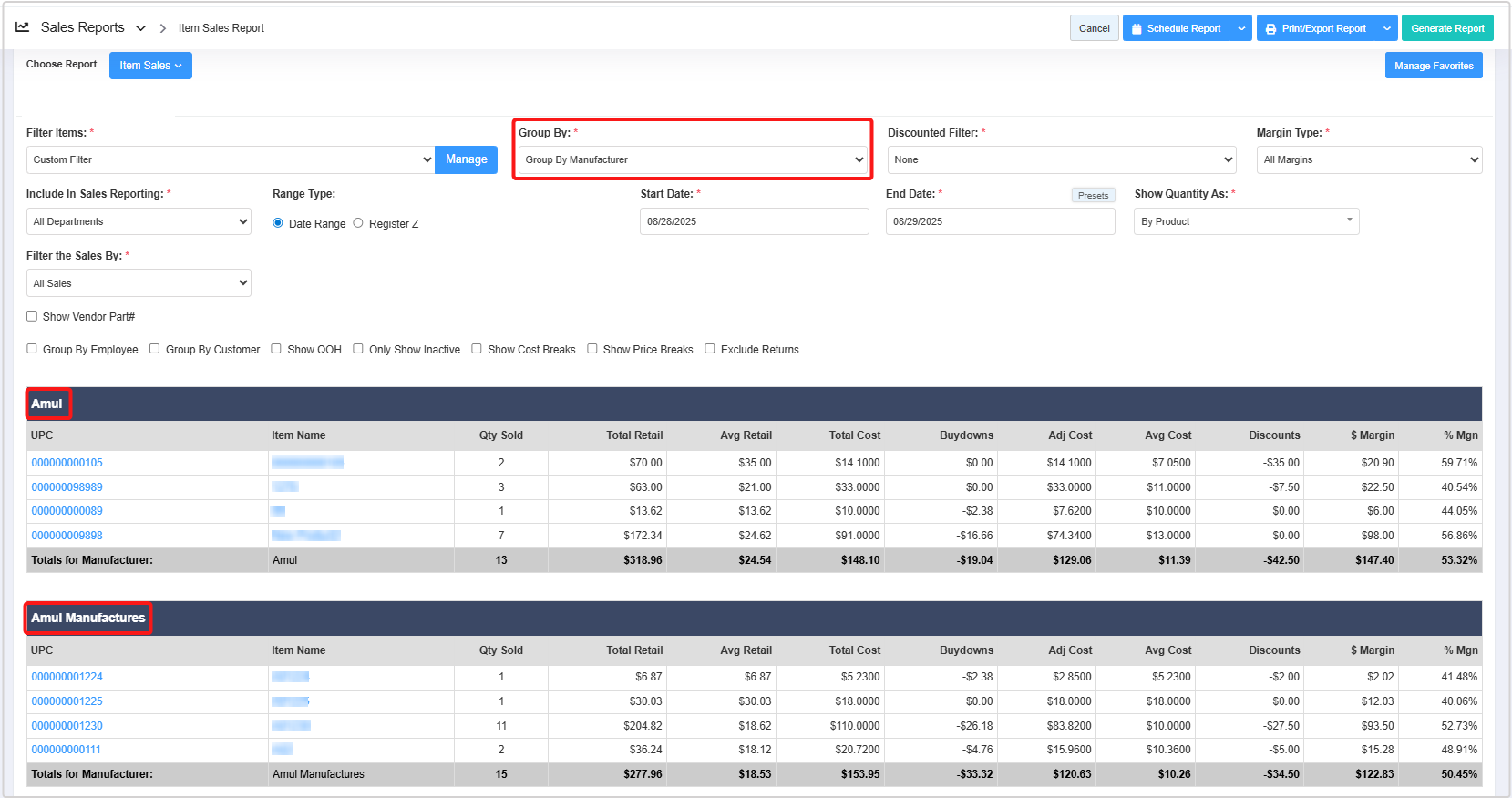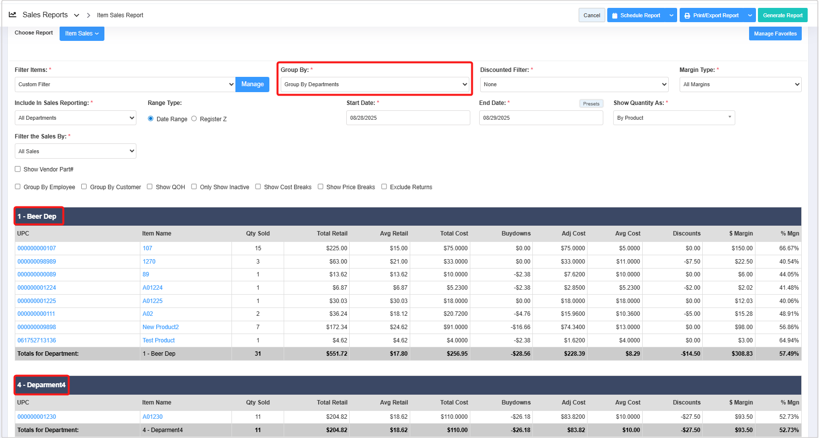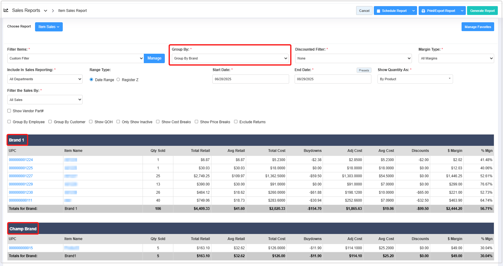 - Group By: The Group By filter lets you organize the report records based on six parameters: Group By UPC, Group By Departments, Group By Category, Group By Manufacturer, Group By Details, and Group By Brand. 3.2 Group By explains further details.
