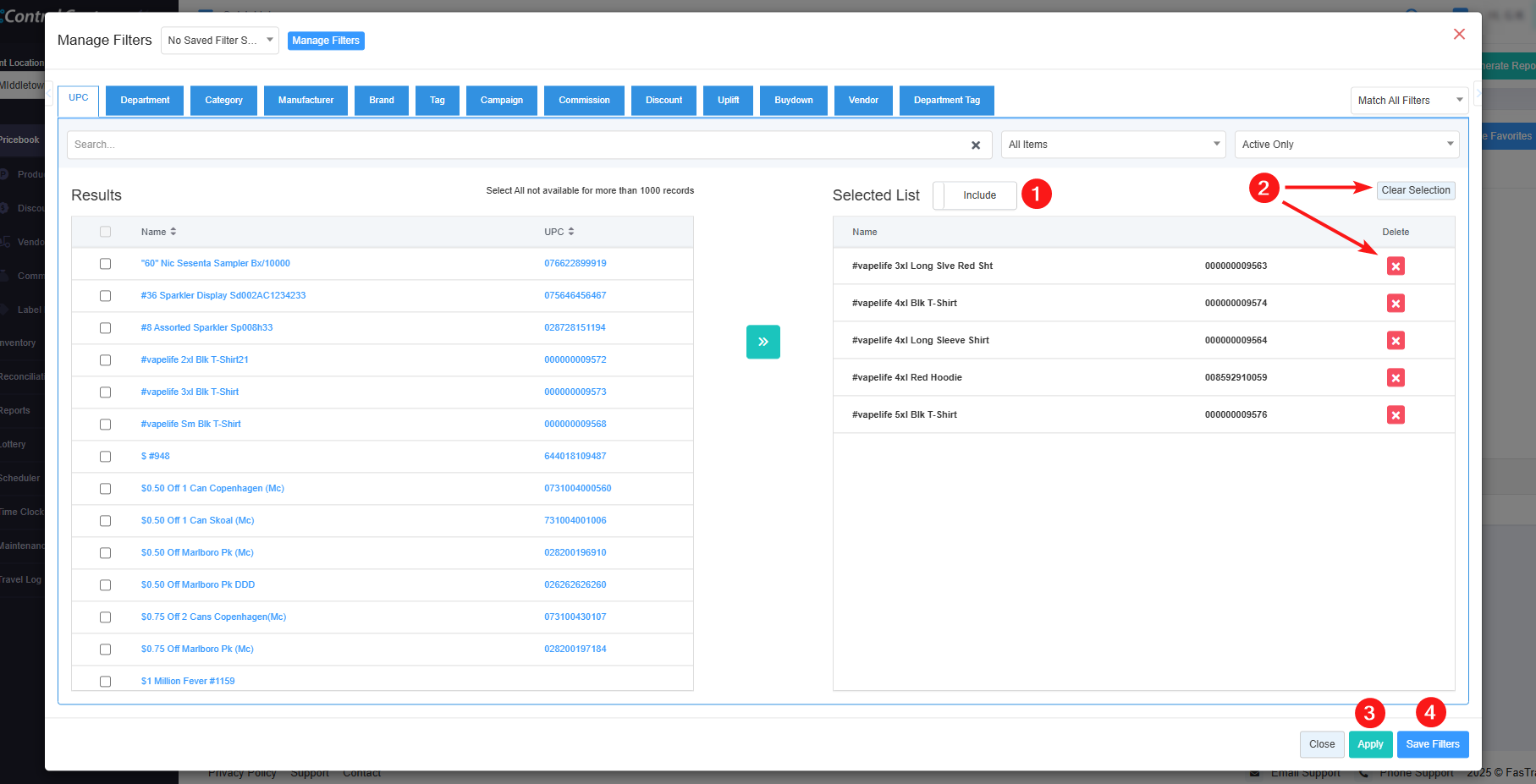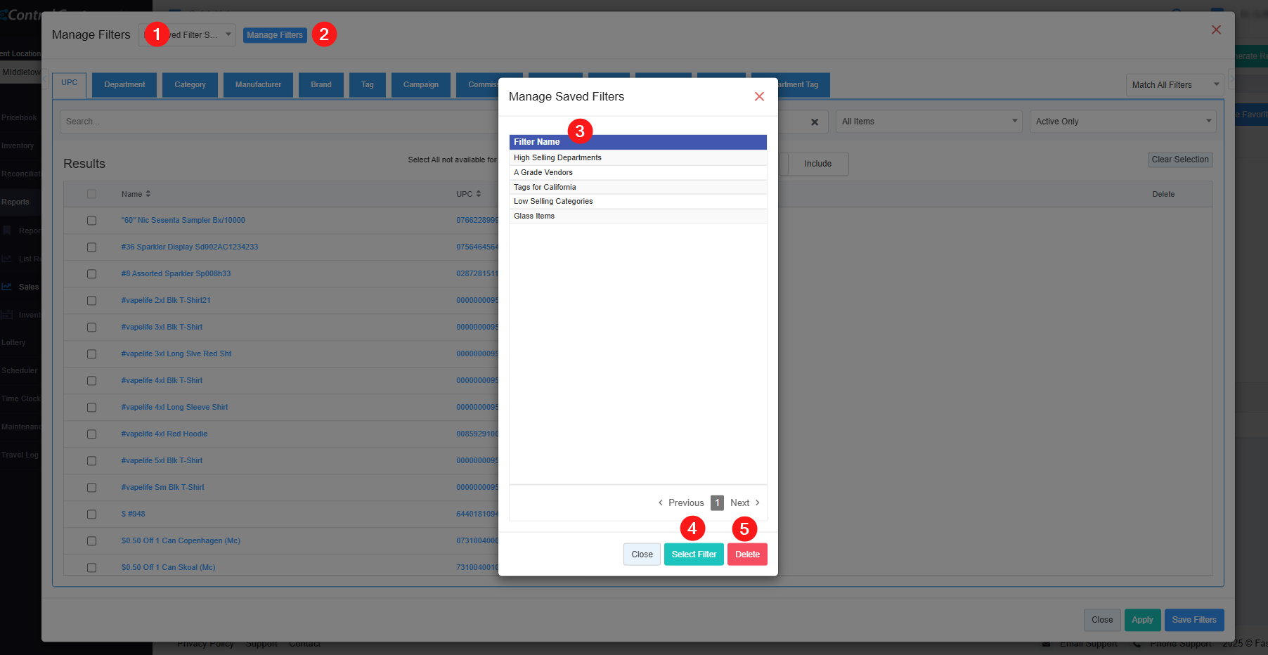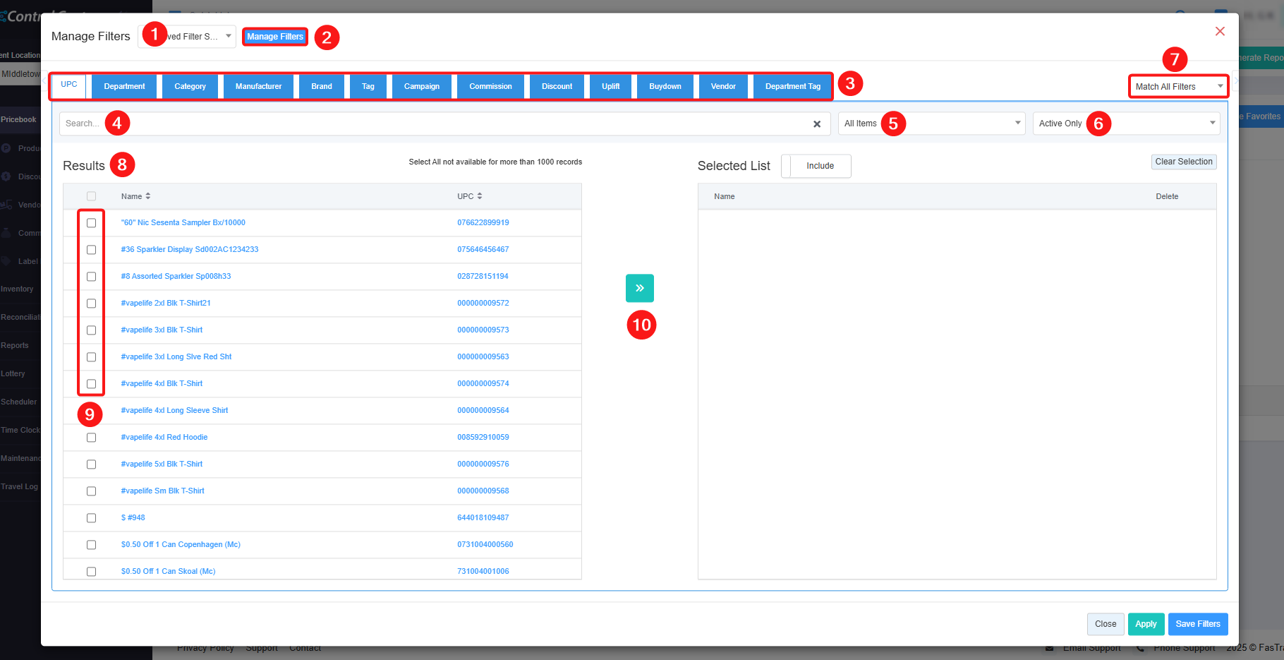 - 8: Results: Here, you see the relevant list of data on the Manage Filters screen for the selected tab. For example, if you have chosen the "UPC" tab, it will show the list of all UPCs. You can use the Search bar for a specific UPC. You will see the data accordingly if you have applied the 4, 5, 6, or 7 filters.