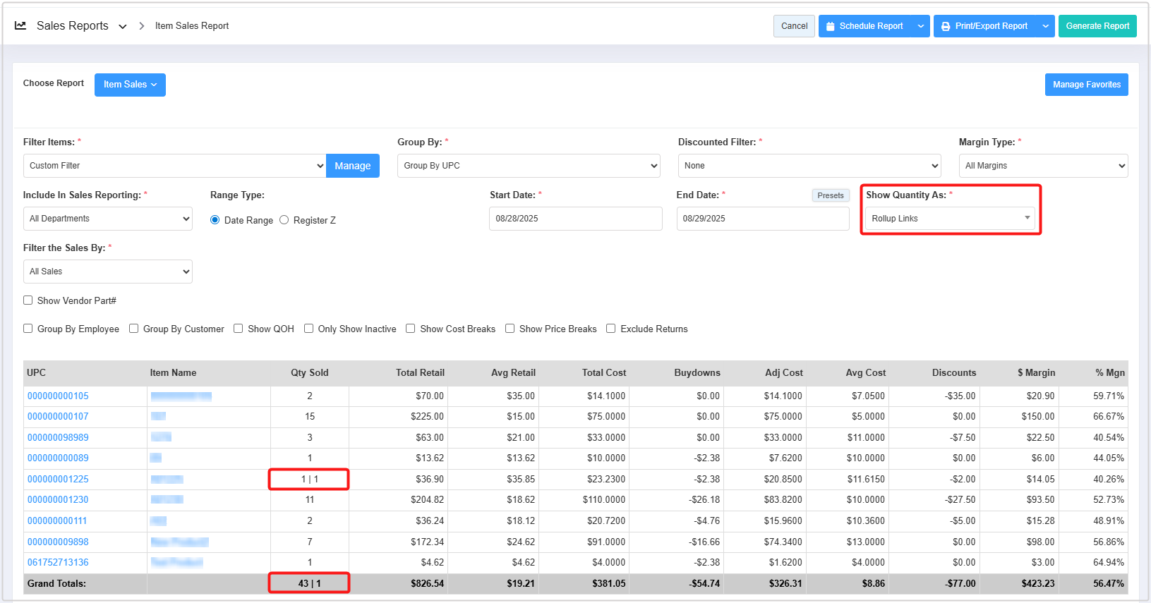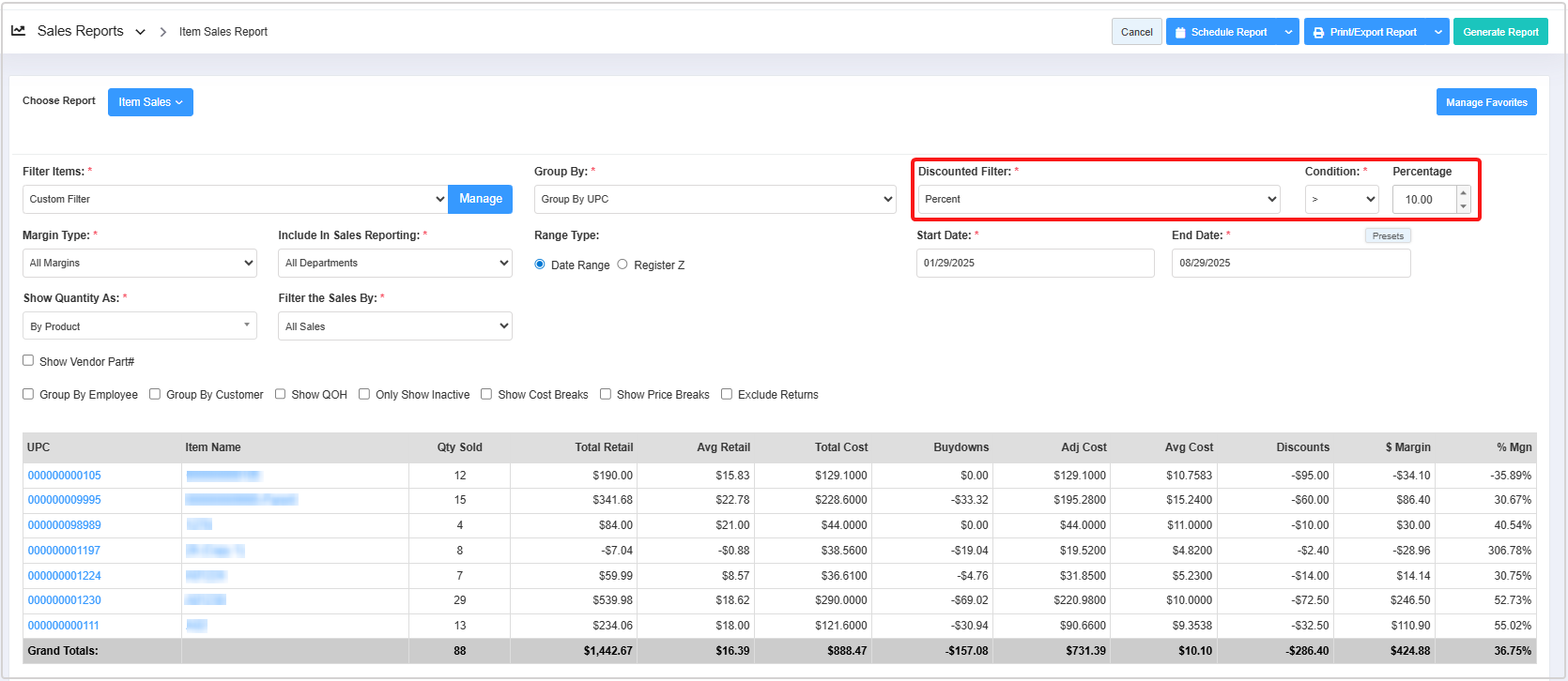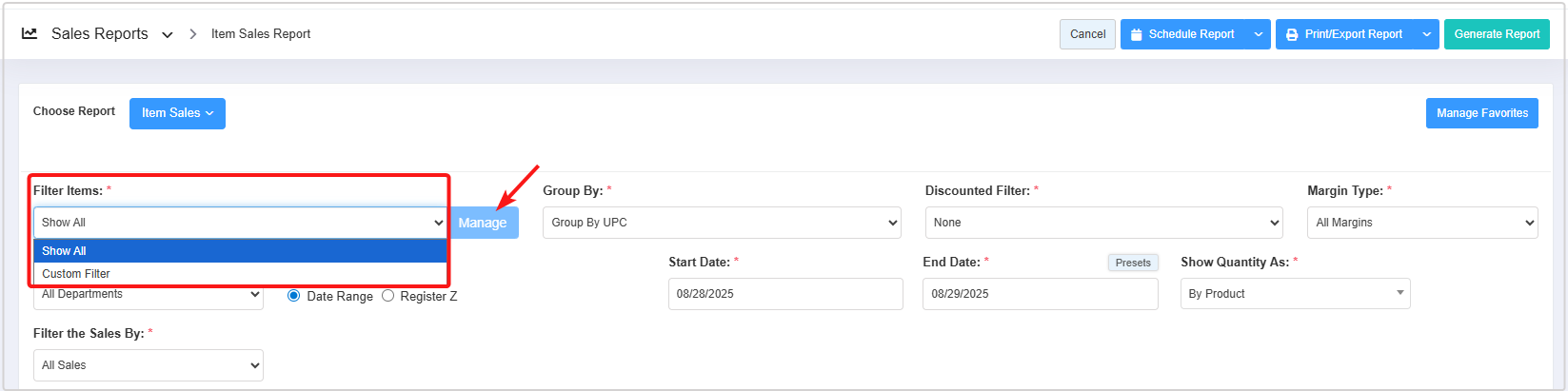 - Filter Items (Custom Filters): The Filter Items filter enables you to view the report based on a selected parameter from thirteen available options: UPC, Department, Category, Manufacturer, Brand, Tag, Campaign, Commission, Discount, Uplift, Buydown, Vendor, and Department Tag. 3.1 Filter Items (Custom Filters) explains further details.
