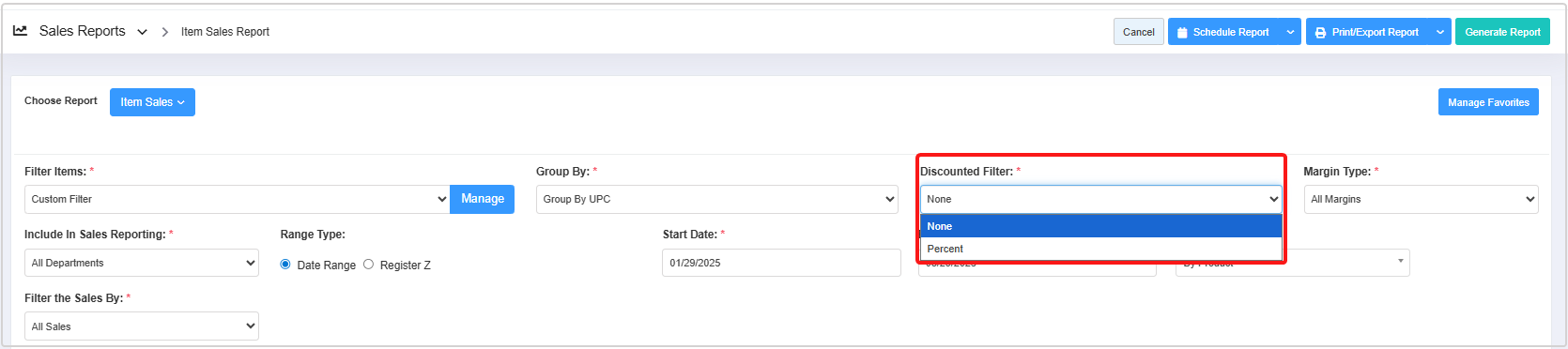 The Discounted Filter lets you view records based on the percentage of discount applied to the products. There are two options: None and Percent.