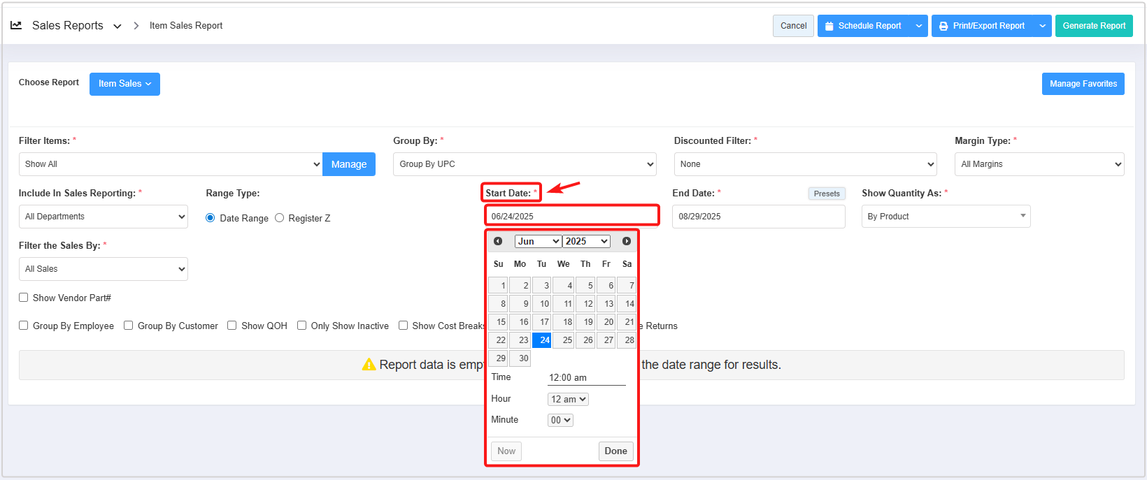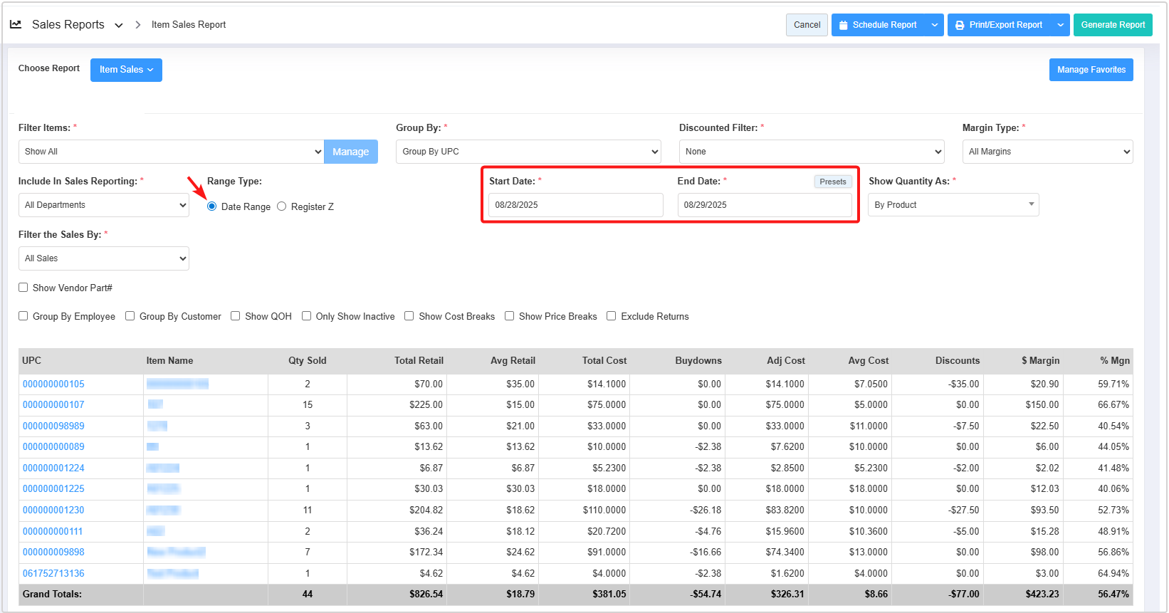 FTx Cloud POS lets you generate the "Item Sales Report" based on two range types: Date Range and Register Z.