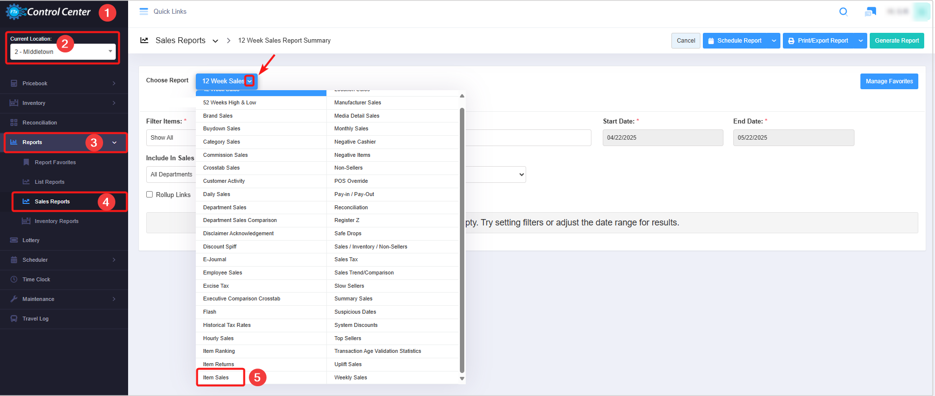- 3: Apply: Click the "Apply" button for the selected parameters. The system will navigate you to the Item Sales Report home screen. Click "Generate Report" to have the system generate reports based on your selection.