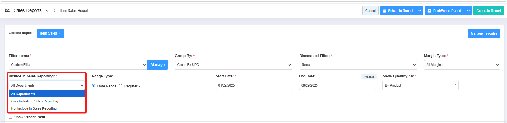 - Only Include in Sales Reporting: When you select this option to generate the report, the system will show only the items from the departments for which the "Include In Sales Reporting" button is enabled.