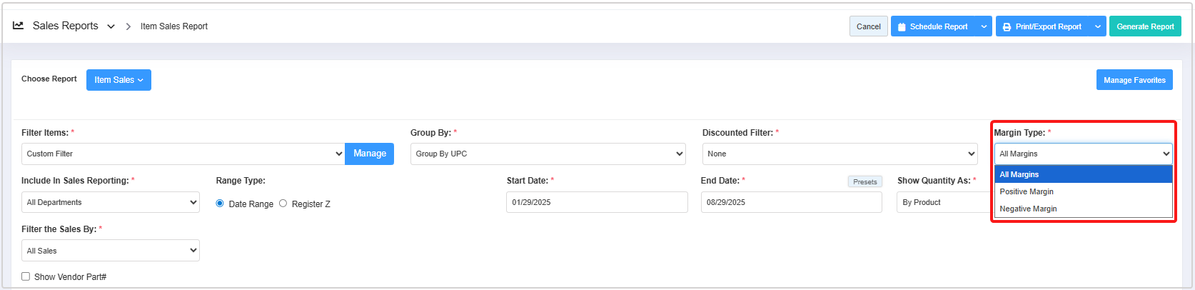 The Margin Type option allows you to filter sales report data based on the profit margin outcome of the sales. It has three options: All Margins, Positive Margin, and Negative Margin.