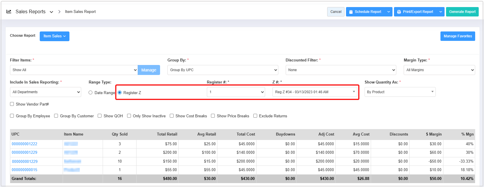Please follow the steps below to generate the "Item Sales Report" based on Register Z.: