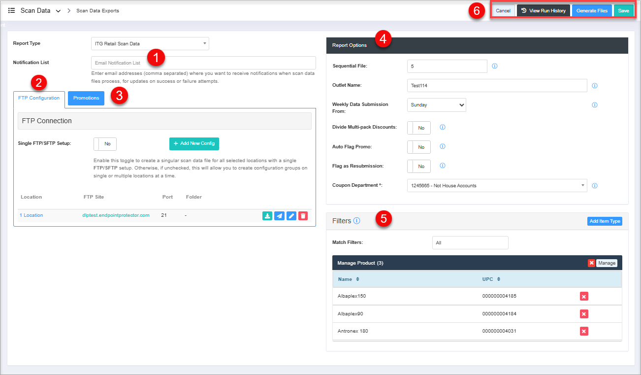 - 6: Filters: This section lets you generate or send scan data files for selected items. You can choose the specific items based on the seven parameters: Products, Category, Department, Department Group, Manufacturer, Brand, and Tags.